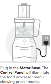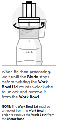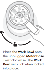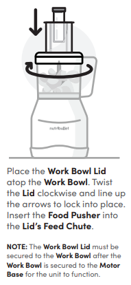 The food processor work bowl and lid must be attached and detached in a specific order to operate. First, secure your blade of choice inside the work bowl. Next, lock the work bowl onto the motor base by twisting clockwise. It will click into place when secured. Next, twist the work bowl lid clockwise so the arrows are aligned and it locks into place. Insert the Food Pusher into the Lid’s Feed Chute. Finally, plug in the motor base. The unit should be disassembled in the opposite order it was assembled: unplug the unit, unlock the lid, then unlock the work bowl from the power base.